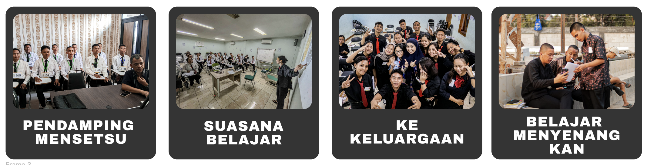 Siswa menjalani proses pembelajaran yang mencakup metode pembelajaran (di antaranya belajar kaiwa, belajar hiragana, katakana dan kanji, serta belajar budaya jepang , yang dikaitkan dengan aktivitas praktek di LPK dan praktek lapangan).
